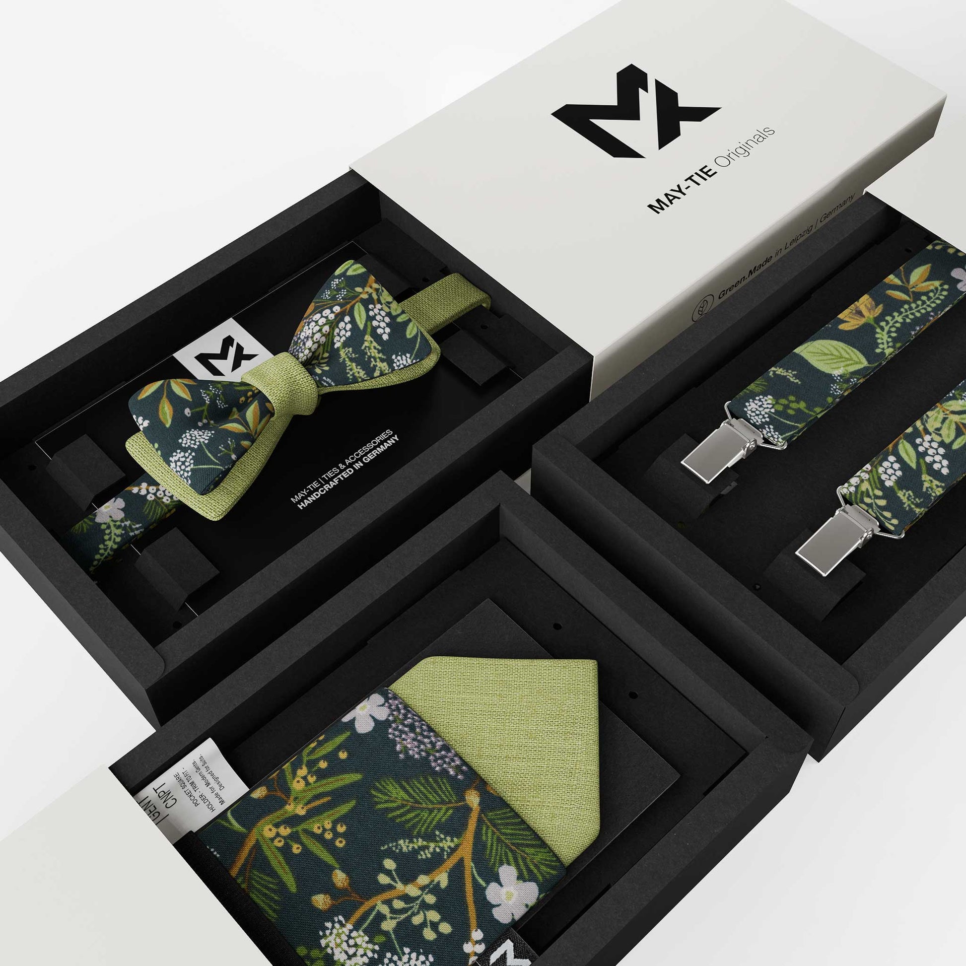 Pre-folded pocket square designed for quick, modern styling. Crafted from Peace Silk and cotton with a refined botanical pattern in green and natural tones. 2-in-1 fold system with adjustable holder — ready in seconds, precise every time.