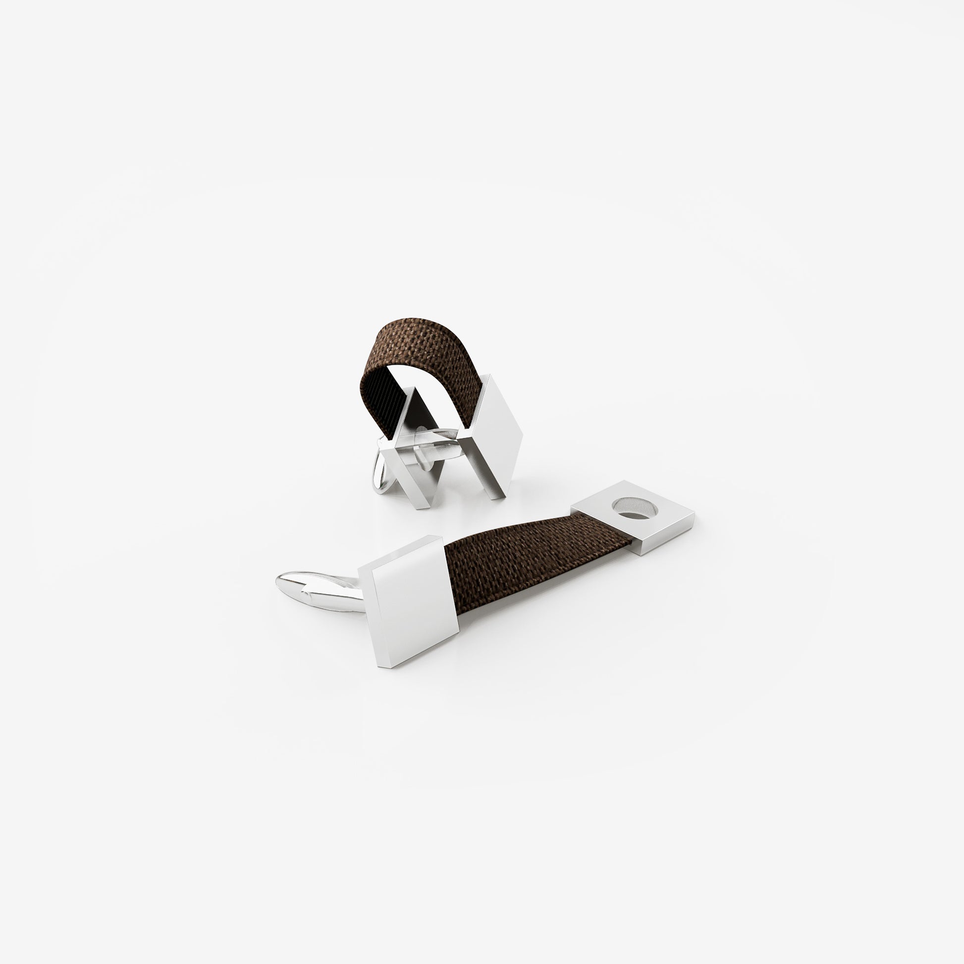 Cufflinks designed for French cuffs with a clean, modern contrast. Crafted from polished metal and Peace Silk in a deep Truffle Brown tone. The silk loop creates a subtle 180° color shift across the cuff — iconic and precise.
